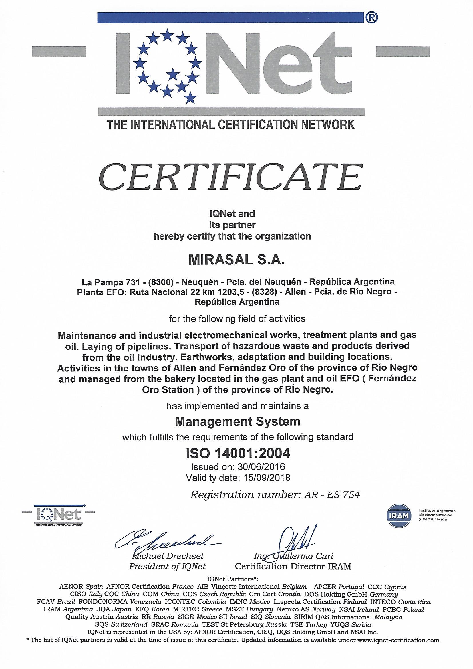 Servicios Petroleros Mirasal S.A. es la única empresa petrolera con triple certificación IRAM – IQNET (ISO 9001- ISO 14001- OHSAS 18001) por su Gestión de la Calidad, Gestión Ambiental y Gestión de Seguridad y Salud Ocupacional.